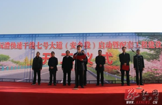 12月25日上午9时38分,沅澧快速干线七号大道暨安乡南互通建设工程开工仪式举行。安乡县委副书记、县长王兆铭现场宣布工程开工。随后大型拖土车、挖掘机等机械相继作业,施工现场人声鼎沸、机械轰鸣,一派热火朝天的景象。
